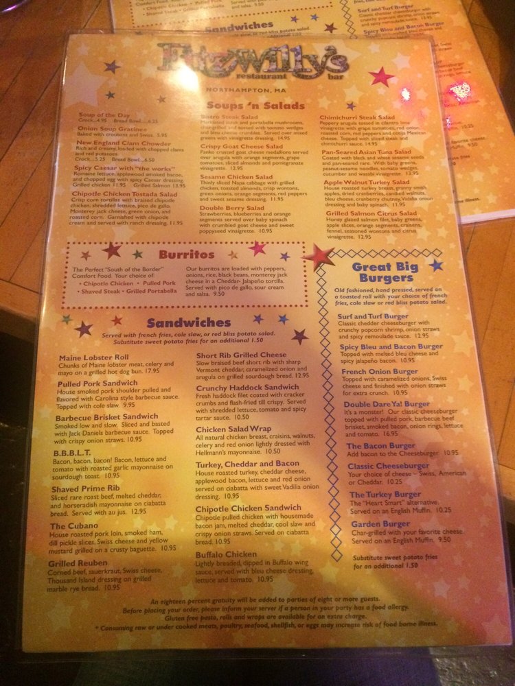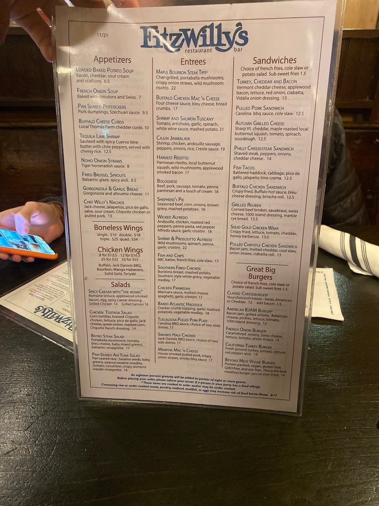 Introducing the menu at Fitzwilly's Restaurant in Northampton, MA offers a diverse range of American cuisine with a focus on quality and flavor. From the Asian Steak and Shrimp Bowl to the Bacon Burger, each dish is carefully crafted to satisfy any craving. The GF menu includes options like Beyond Burger and Cajun Jambalaya for those with dietary restrictions. The catering menu features crowd-pleasers like Buffalo Chicken Mac 'N Cheese and Chicken Marsala, perfect for events or gatherings. With a full bar, outdoor seating, and free Wi-Fi, Fitzwilly's creates a welcoming atmosphere for all guests. Whether you're looking to enjoy a casual meal or host a special event, Fitzwilly's Restaurant is the perfect choice for a memorable dining experience.